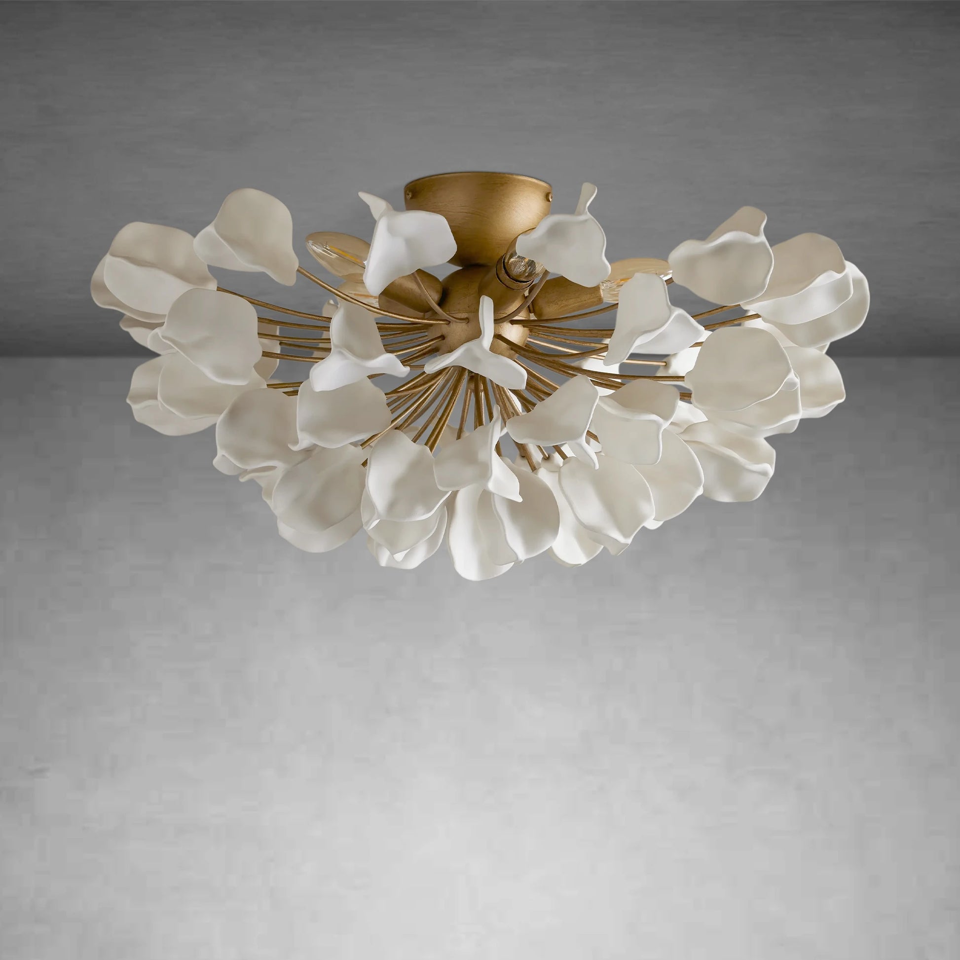 Inspired by the ethereal elegance of the lunaria plant, our Lunaria Lighting Collection captures the delicate beauty of nature in bloom. Handcrafted by ceramic artisans in Italy, each light artfully displays a cluster of ceramic petals that cascade from an iron frame creating a sense of organic movement. Offering a gentle, diffused glow, Lunaria is a luminous statement piece that feels both grounded and otherworldly.